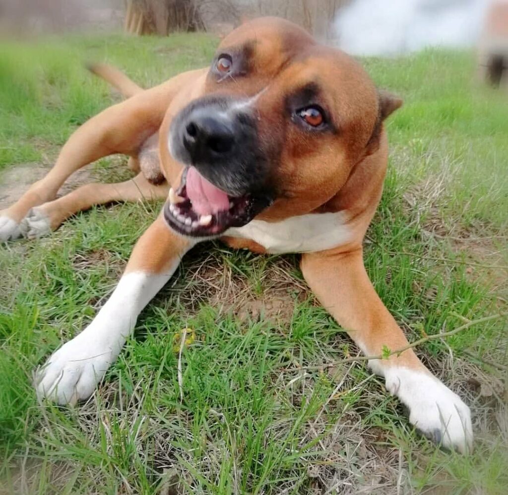 “Цього пітбуля нам залишила дівчина у 2014 році. Вони тікали в Маріуполь, вона була на восьмому місяці вагітності. Їм сказали, що в поїзд із тваринами не можна, і вона попросила нас забрати його або “доведеться просто випустити його за рогом”, — згадує Олена.